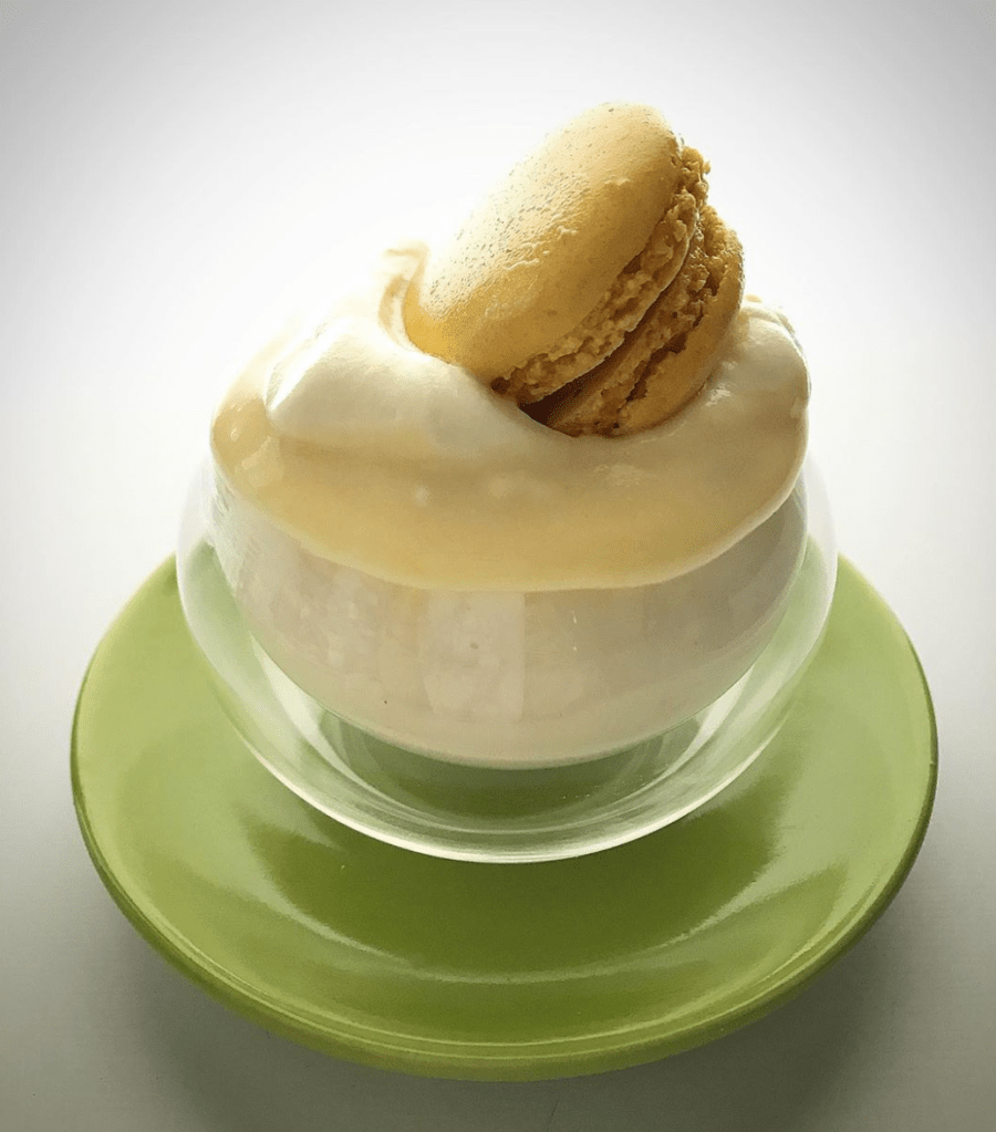 - Pour the Mousse over the tapioca pudding softly and garnish with Macaron Cookie- preferably vanilla or pistacho. 🙂